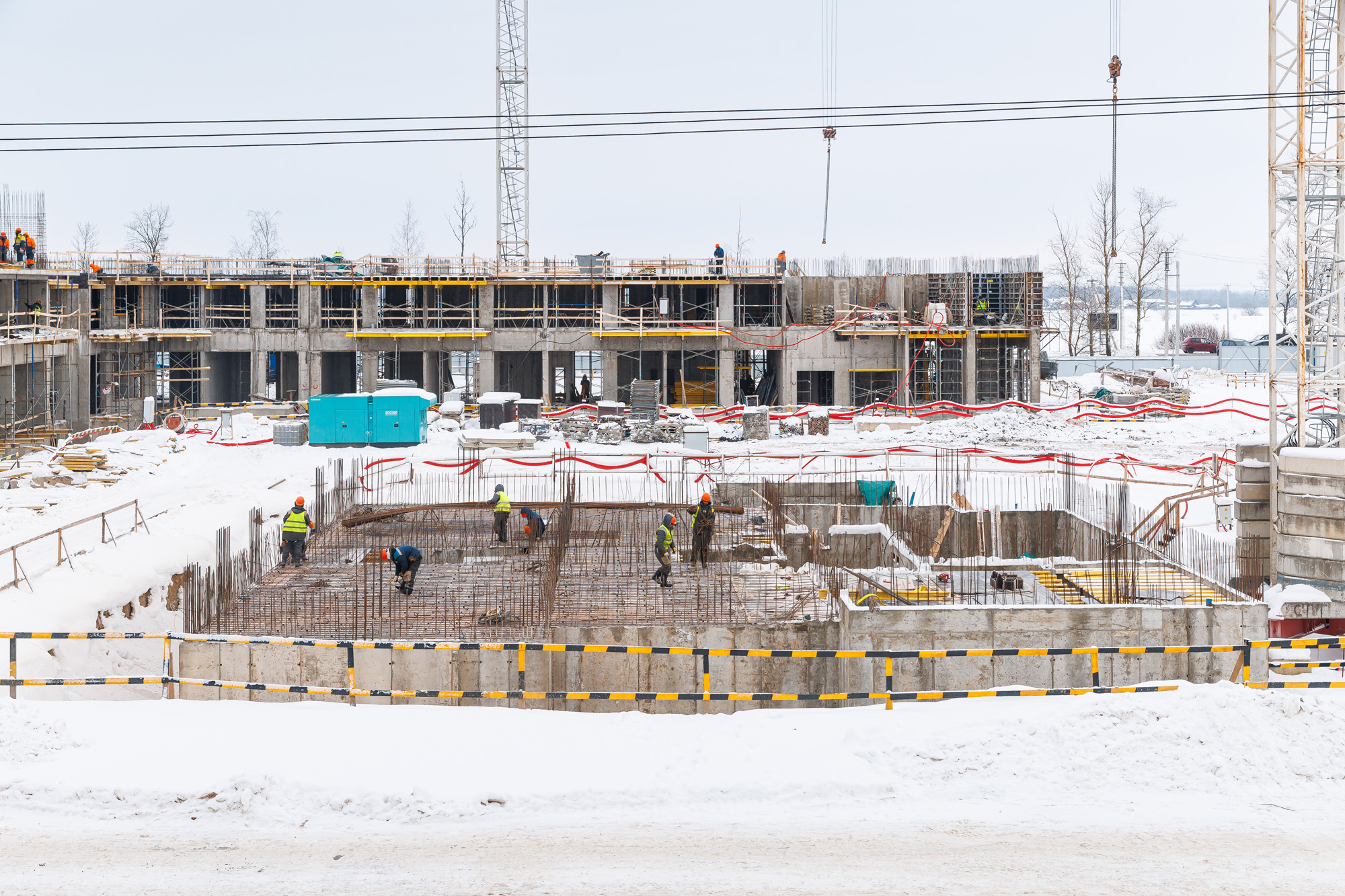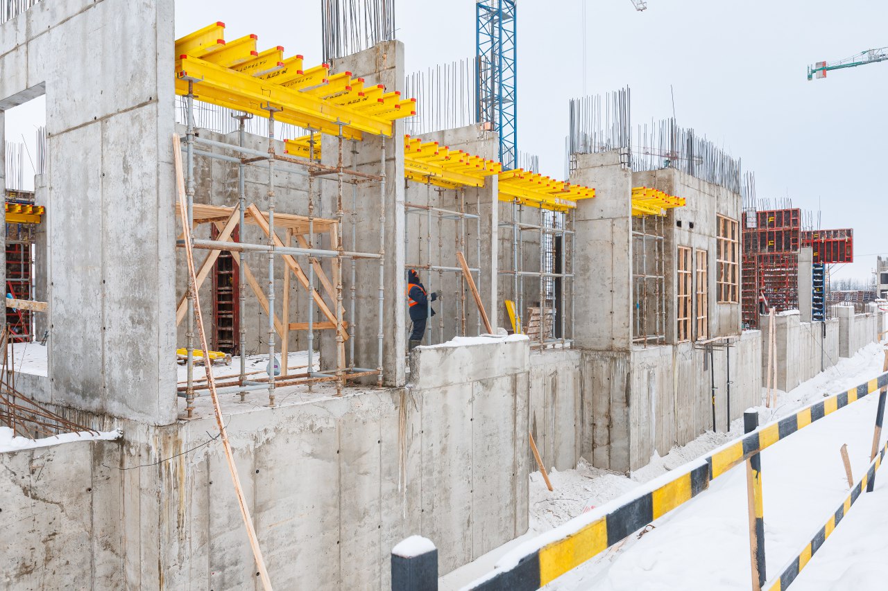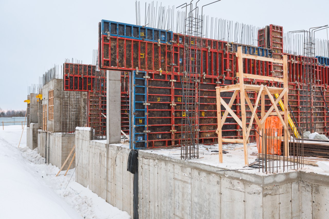 Участок 1:Корпус 1 и 2: устройство стен 1-го этажа, завершение перекрытий подвала