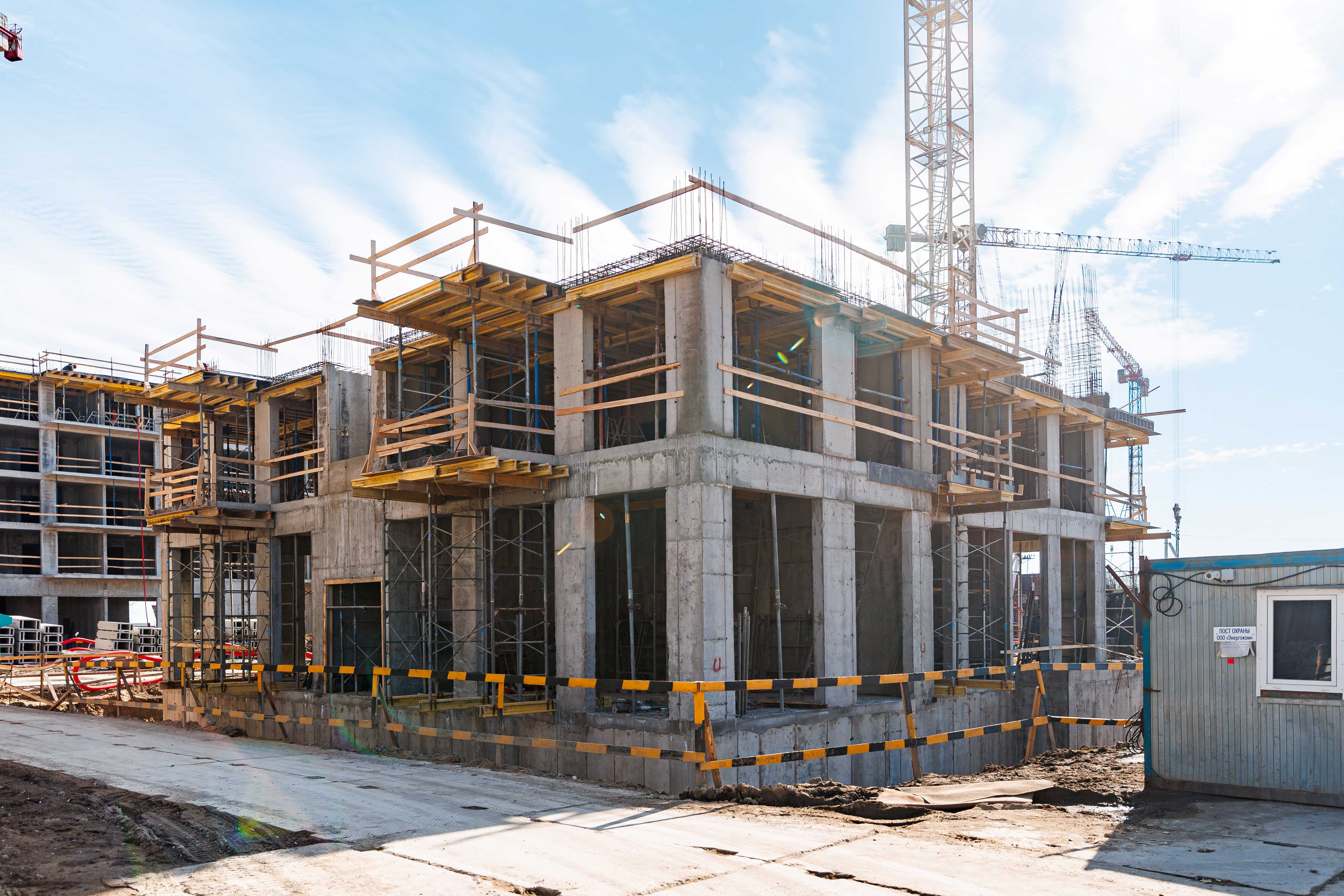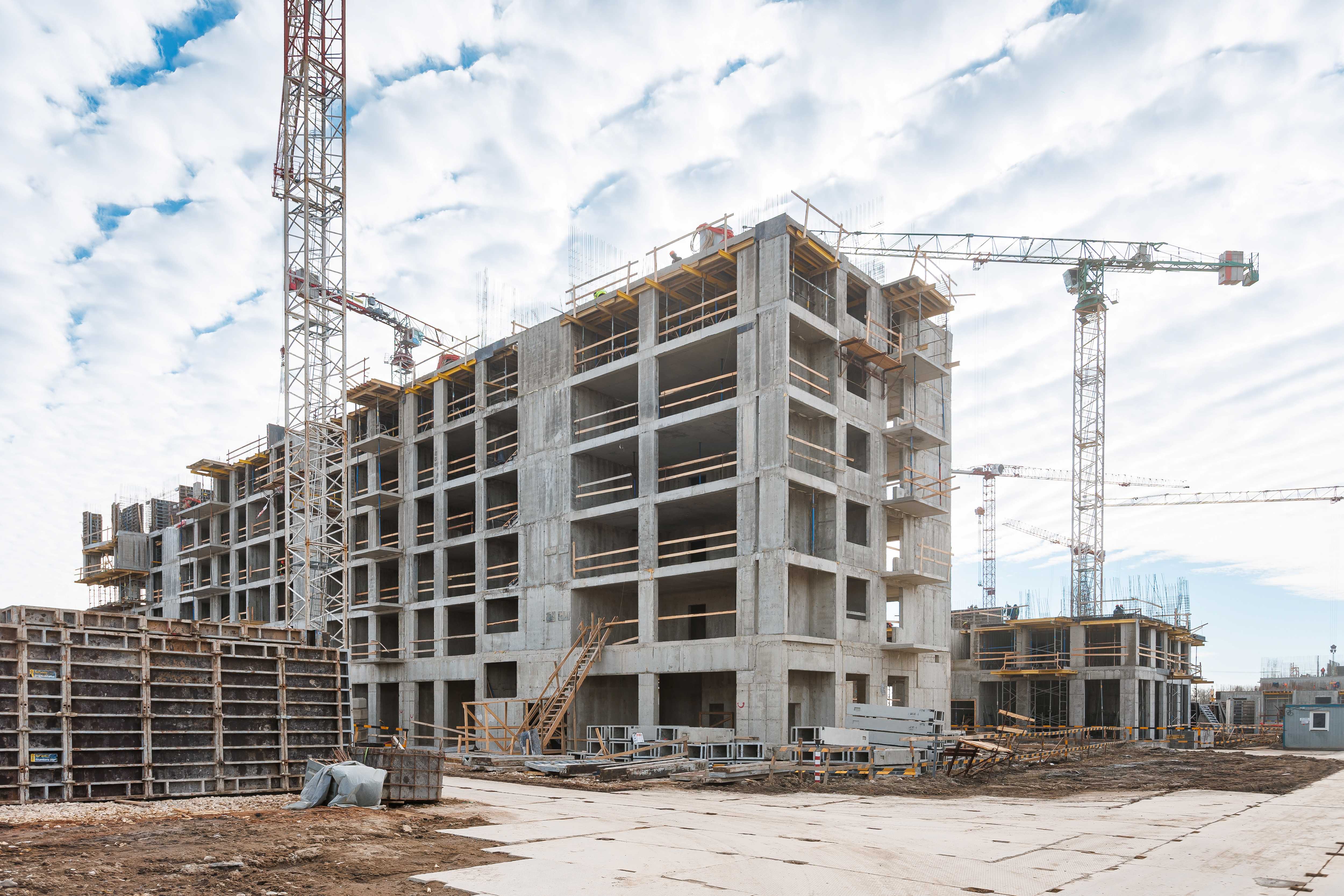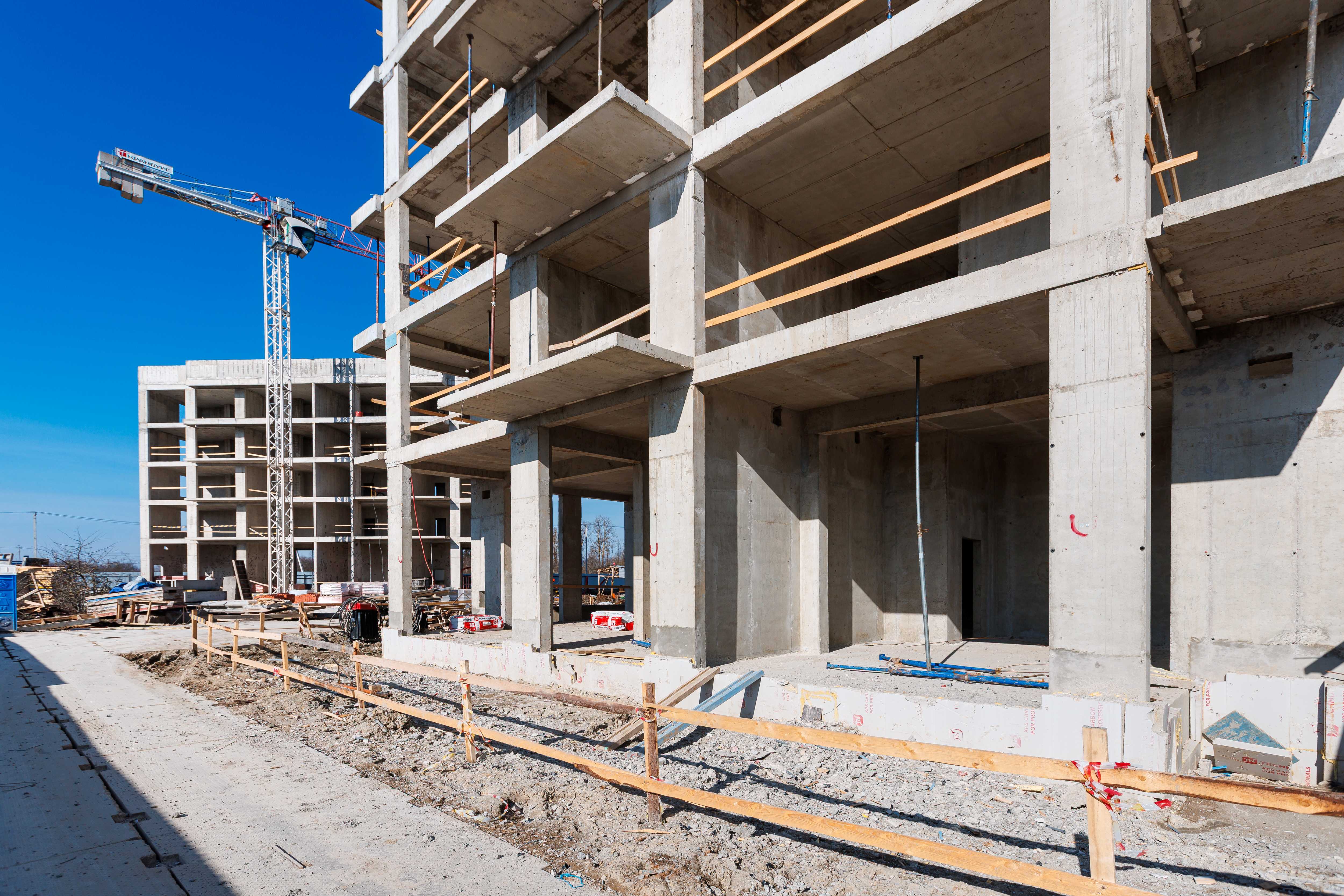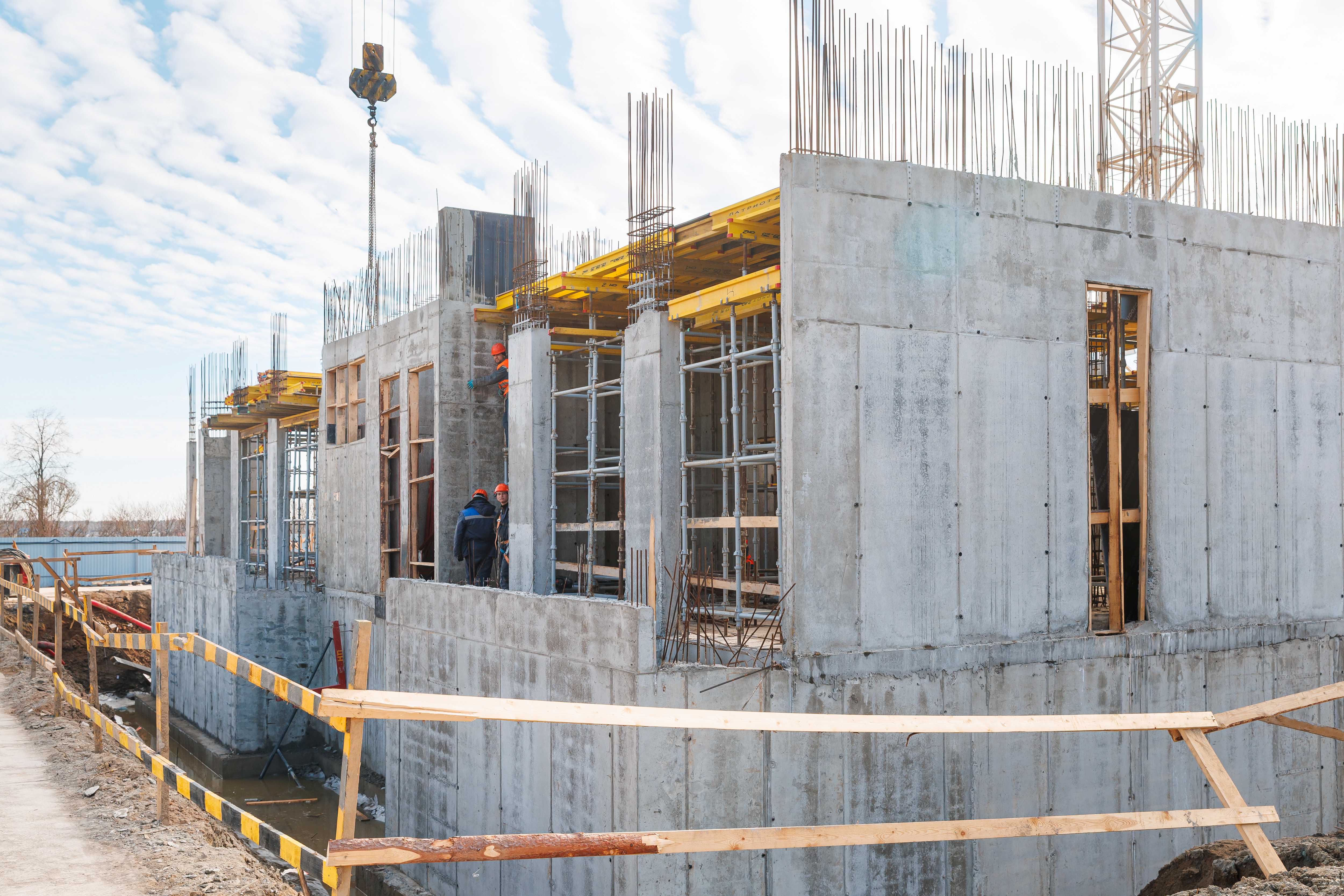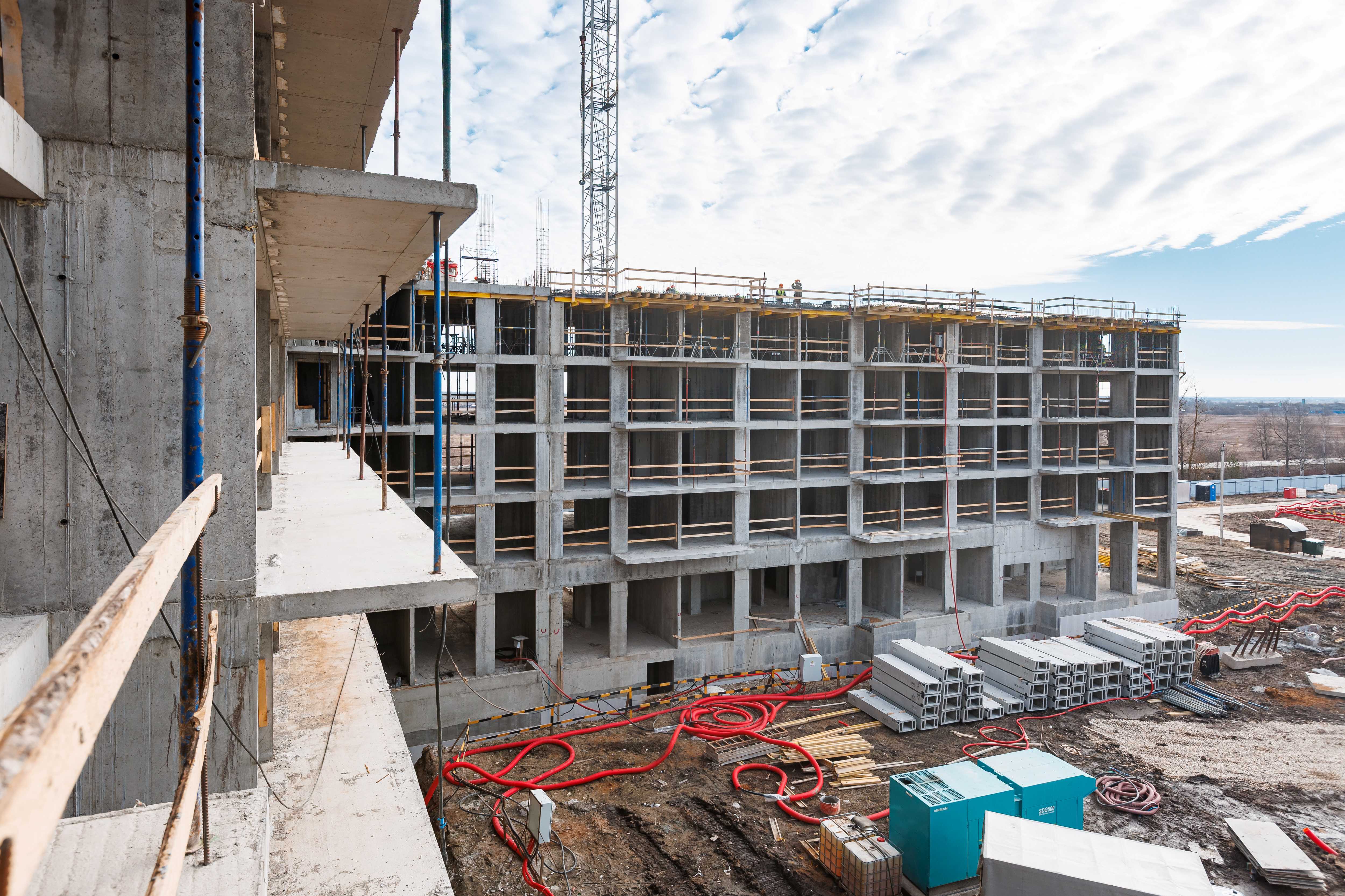 Корпус 1: устройство стен и перекрытий 1-2-го этажей, начало работ по устройству стен 3-го этажа.