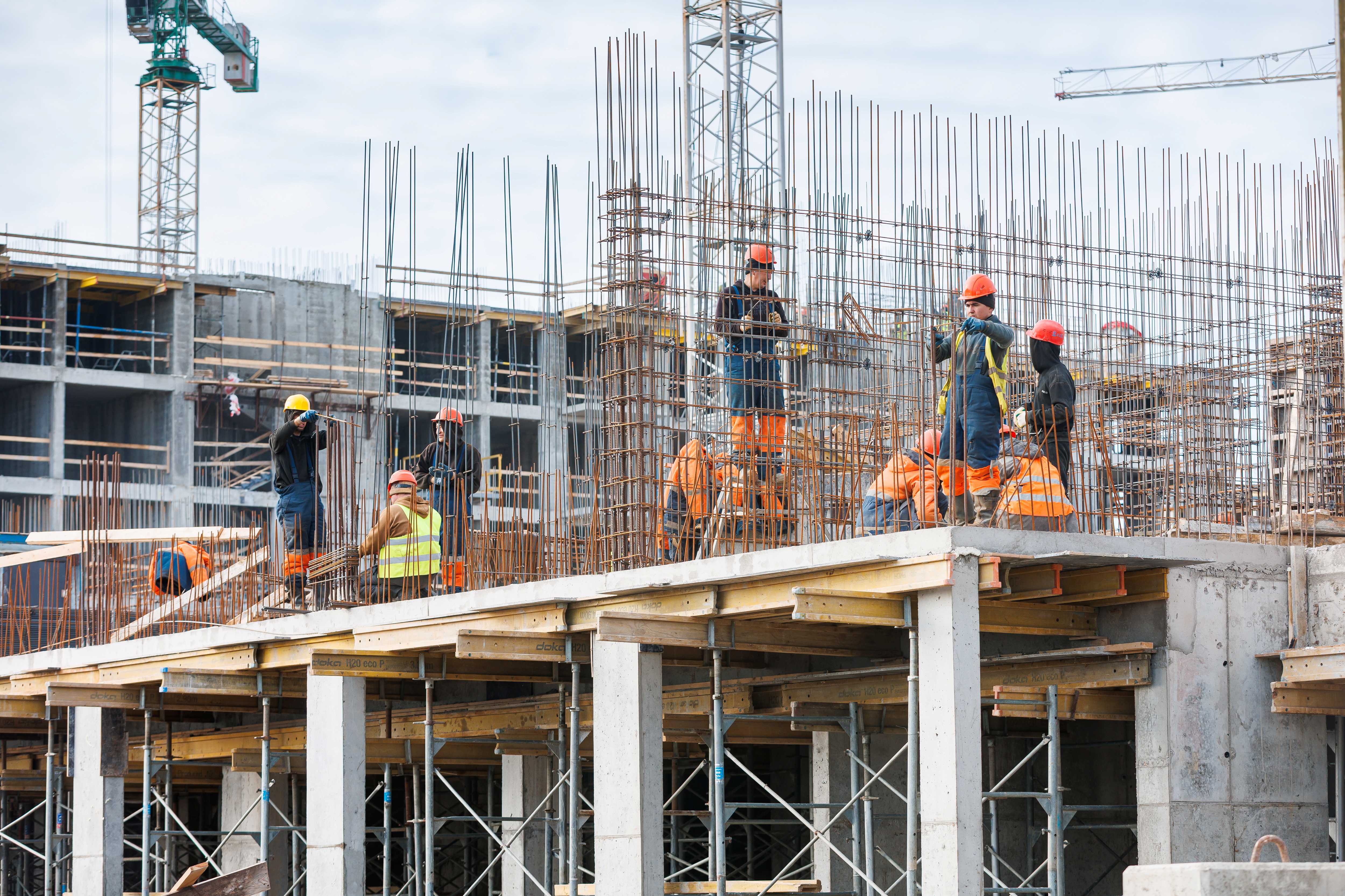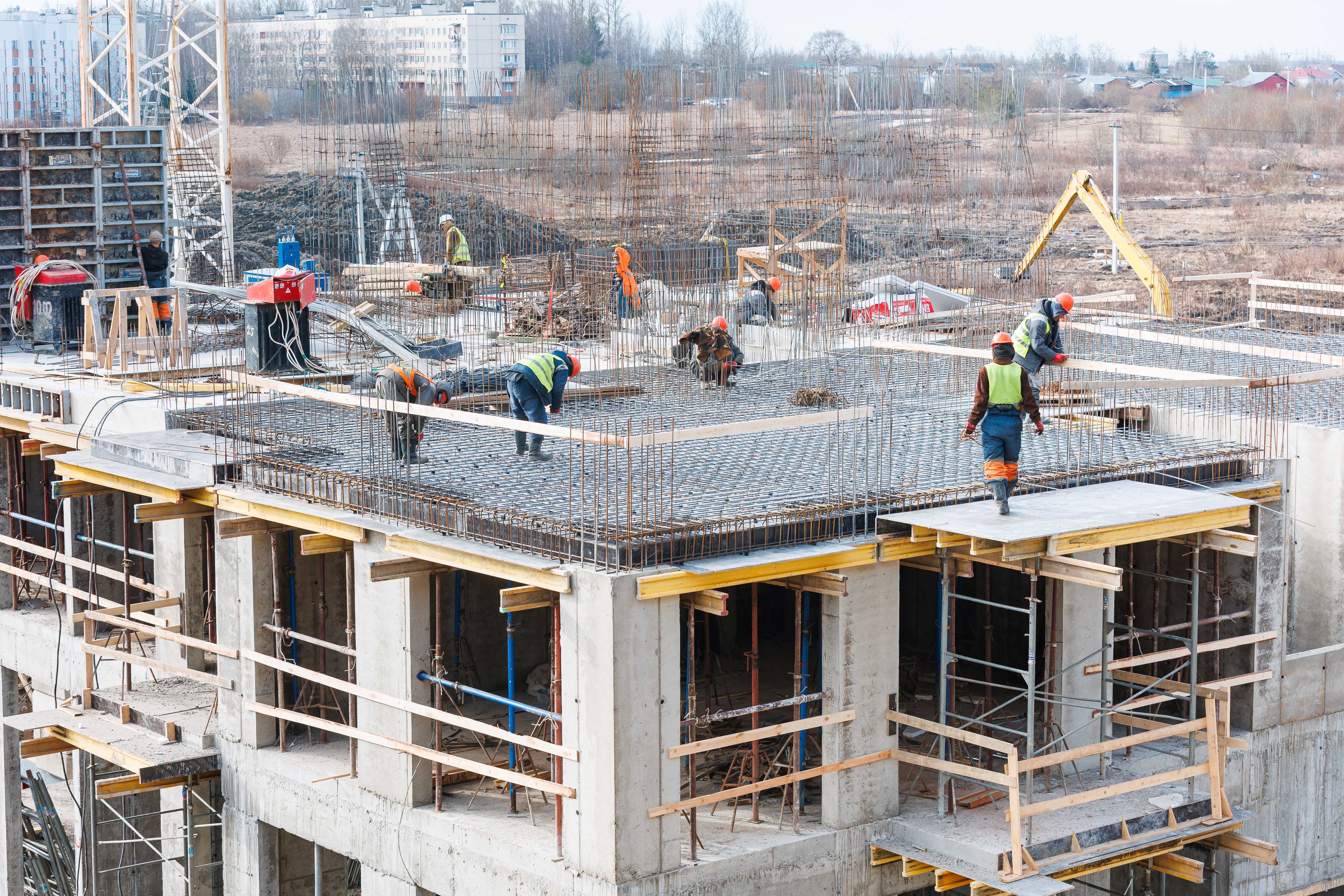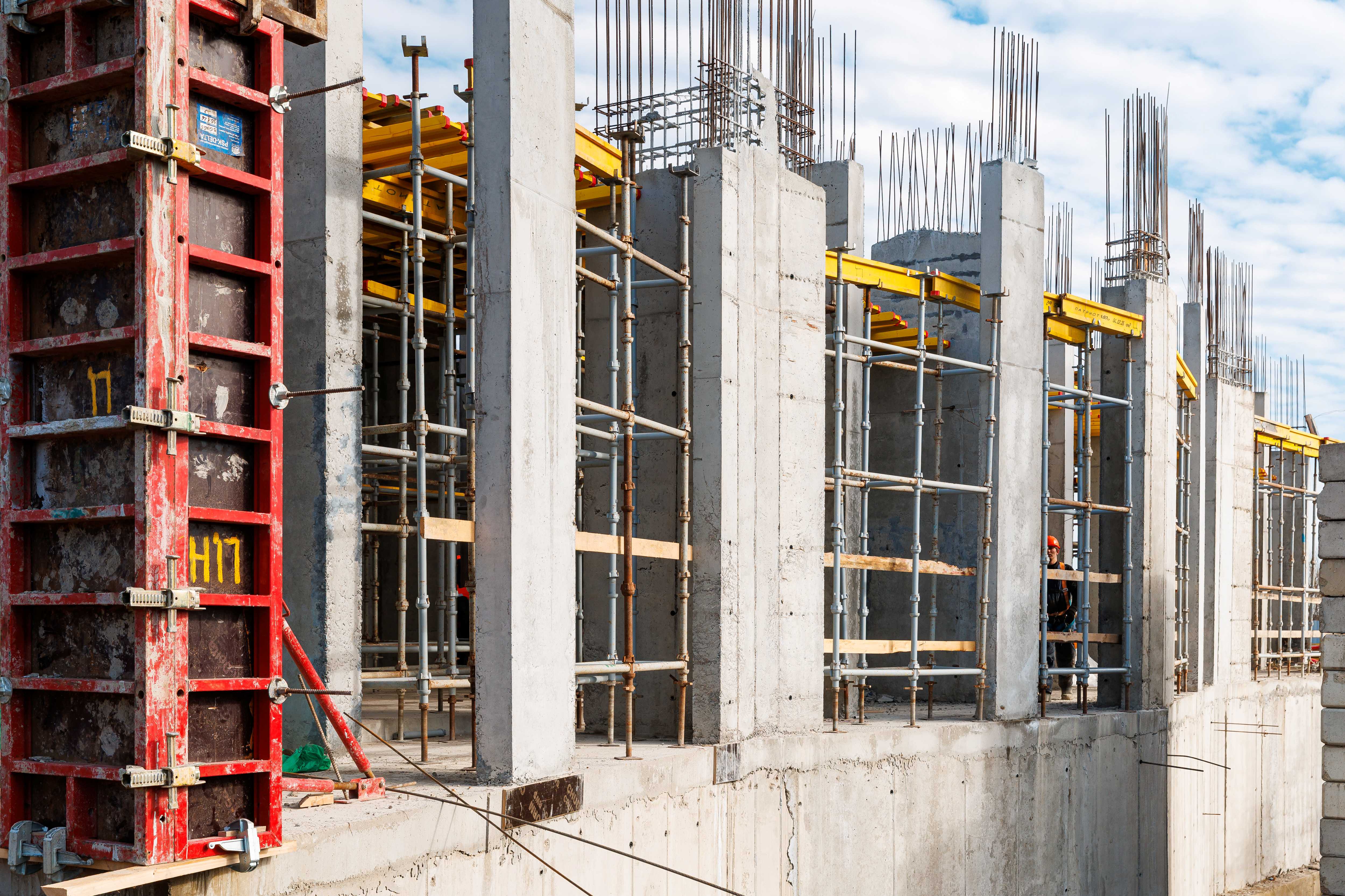Участок 1 Корпус 1: устройство стен и перекрытия 2-го этажа, начало работ по устройству стен 3-го этажа.